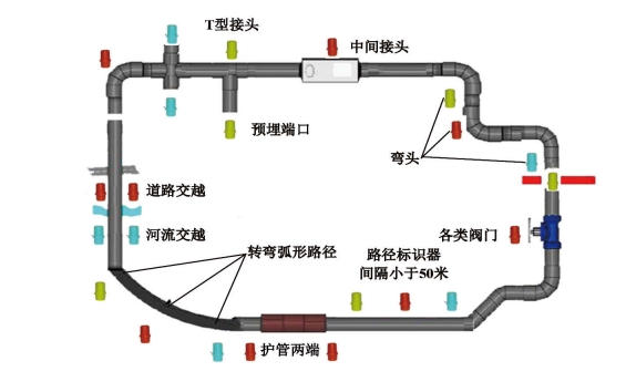 在地下管线末端、T型接头、预埋端口、中间接头、弯头、各类阀门、护管两端、转弯弧形路径、河流交越等处附近或正上方埋设电子标识器可以迅速精确定位管线位置获取管线相关材质、用途、权属、建造维修等属性信息。