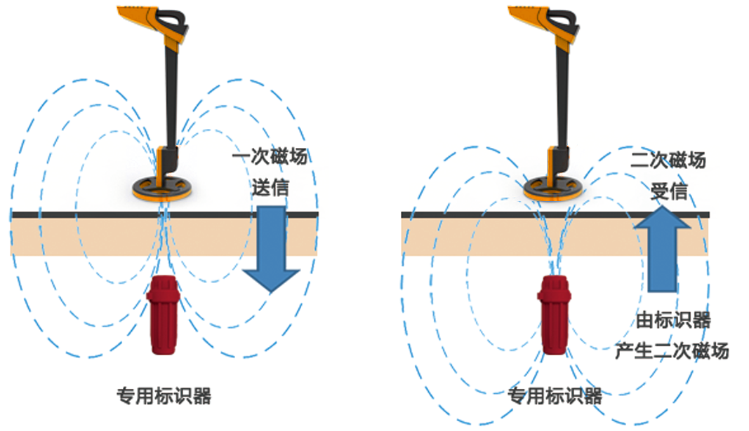 当使用电子标识探测仪对地下电子标识器进行探测时,探测仪先向地下发出一定频率的电磁波信号,当靠近标识器时,电子标识器会反射定位仪发出的信息,从而被探测仪发现和接收,并通过声音和读数来告知操作者地下设施的全面信息。